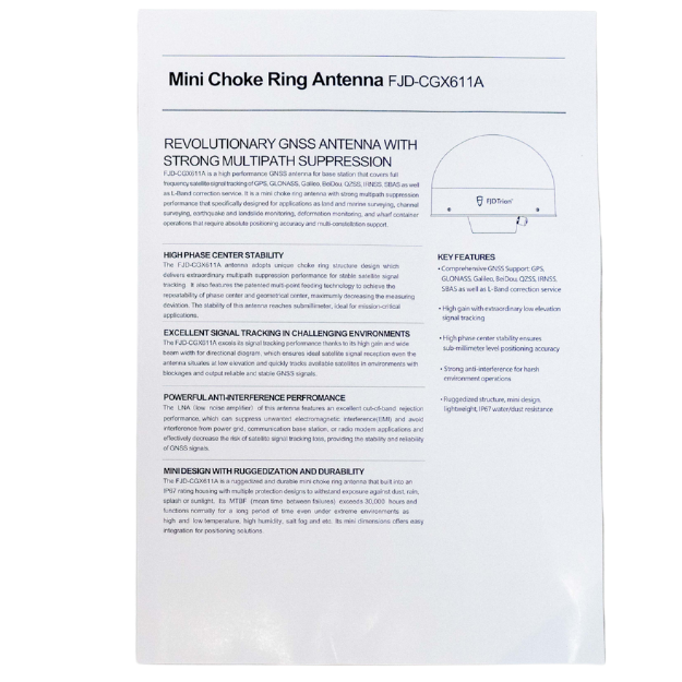 The following lists detail the complete components included in the FJD N10 GNSS Reference Receiver system and the Choke Ring Antenna. Each item is carefully packed to ensure safe delivery and seamless setup, providing all necessary accessories, cables, and documentation required for immediate deployment and operation. For a closer look, please watch our N10 Product Packaging Video, which demonstrates the unboxing and all included components.